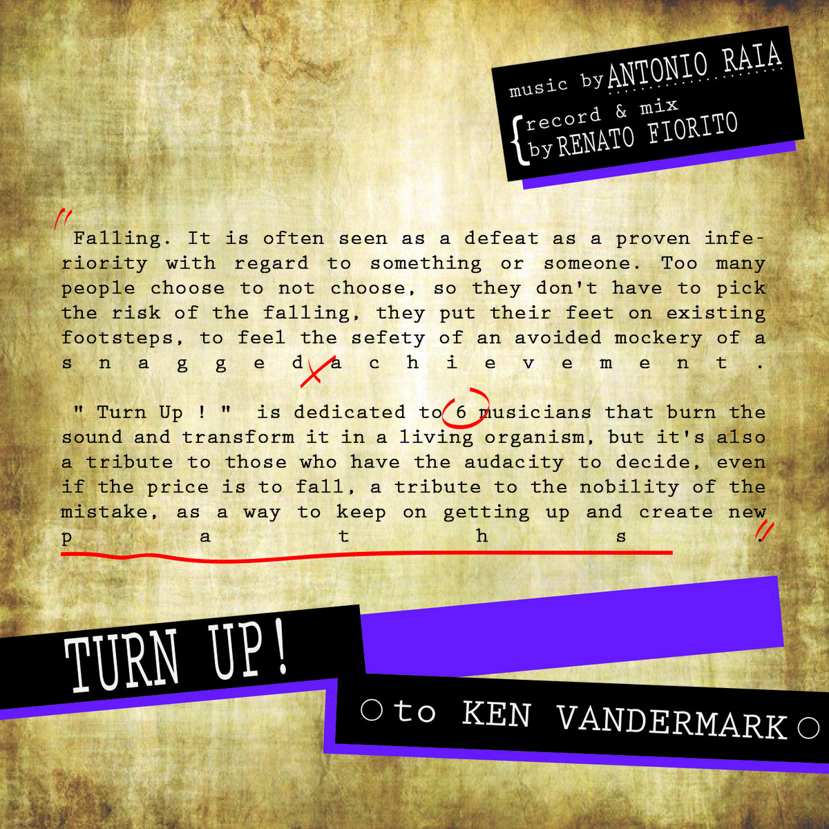 " Turn Up ! " is dedicated to 6 musicians that burn the sound and transform it in a living organism, but it's also a tribute to those who have the audacity to decide, even if the price is to fall, a tribute to the nobility of the mistake, as a way to keep on getting up and create new paths.